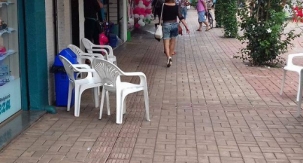 Cena comum no centro de Campo Mourão: alguma coisa no meio do caminho do piso podotátil. Neste caso, são cadeiras em cima da faixa para orientação de deficientes visuais.