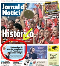 O Jornal de Notícias, de Lisboa, destacou neste domingo o título do Benfica, tetracampeão português. Um pouco mais abaixo, na primeira página, está o encontro do papa Francisco com Lucas, o “menino milagre” de Juranda. Foi com a recuperação dele, reconhecida como milagre pelo Vaticano, que Jacinta e Francisco, os irmãos pastorinhos de Portugal, foram canonizados pelo papa. Lucas estava internado na Santa Casa de Campo Mourão quando ocorreu o milagre, em 2013.
