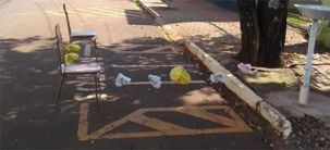 “Na rua Araruna, entre as avenidas Irmão Pereira e José Custódio de Oliveira, cadeiras, cordinhas e sacolas plásticas cercam estacionamento reservado para motocicletas”.