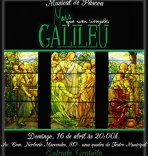 “Mais que um simples Galileu”. Um musical contemporâneo, que conta a história de Jesus, sob a ótica de Nicodemos, será apresentado neste domingo (10h). “São interpretações enriquecedoras que com certeza tocarão seu coração”, destaca a organização do evento. “Você entenderá melhor que Jesus Cristo é muito mais que um simples galileu”. A apresentação será na Igreja Batista (av. Comendador Norberto Marcondes, 813, a uma quadra do Teatro Municipal). Entrada gratuita.