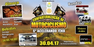 Fênix – Acontece neste domingo o 6° Acelerando Contra a Pólio. Trata-se de evento organizado pelo Moto Clube Lebres do Asfalto, com apoio do Rotary. A renda será beneficente à Apae. São esperados mais de mil motociclistas (ano passado foram 1.053). O almoço custa R$ 30.