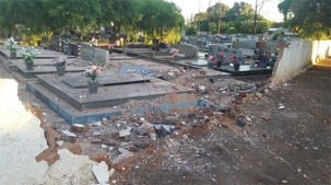 Um carro perdeu o controle e bateu no muro do Cemitério Municipal de Campo Mourão. Foi na madrugada deste sábado. O Vectra (provavelmente em alta velocidade para o local) não conseguiu fazer o contorno em frente à Ciretran e foi direto pro muro. Além de derrubar um bom pedaço do muro, o veículo ainda atingiu três túmulos. O casal estava no veículo e não se machucou.