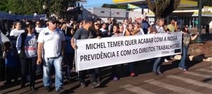 O presidente Michel Temer, o deputado Rubens Bueno e o governador Beto Richa foram os principais alvos da manifestação desta sexta-feira em Campo Mourão. “Fora Temer” foi a palavra de ordem mais ouvida. A presença de professores da rede estadual fez Richa também ser bem lembrado. Já Bueno foi criticado por ser de Campo Mourão e por já ter votado a favor dos projetos da terceirização e da reforma trabalhista. “Deputado Rubens Bueno, de que lado você está?”, questionava uma faixa.