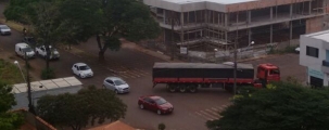 Carreta passa pela av. Goioerê, no centro de Campo Mourão. Ao virar na rua Interventor Manoel Ribas, precisou parar para esperar a passagem de veículos, formando uma fila de carros atrás dela.