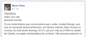 O avião que caiu neste domingo à noite, entre Cambé e Londrina, matando oito pessoas, transportava familiares do presidente da Federação dos Trabalhadores de Cooperativas, Mauri Viana. Entre os mortos estão a ex-mulher, duas filhas e um neto dele.