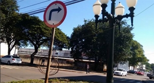 Na esquina da av. Manoel Mendes de Camargo com a rua Mato Grosso, a placa de trânsito tem duas utilidades: orienta os motoristas e impede que fio que caiu do poste fique esparramado pela avenida.