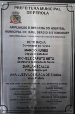 Aconteceu nesta quinta-feira a inauguração da reforma e ampliação do Hospital Municipal de Pérola. E o que é que a gente tem a ver com isso? Tem que olha só a moral do deputado Márcio Nunes. O nome dele não só foi colocado na placa, como aparece abaixo somente do governador Beto Richa. Ficou acima do secretário de Estado Michele Caputo (Saúde) e até do prefeito Darlan Scalco.