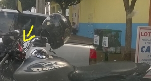 Alguém deixou a moto estacionada, na av. Capitão Índio Bandeira, centro de Campo Mourão, com a chave na ignição e o capacete no retrovisor.