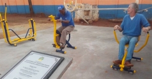 Olha aí o seu Reinaldo, caseiro do estádio Roberto Brzezinski, testando os equipamentos da academia da terceira idade instalada no complexo esportivo. A instalação foi realizada nesta sexta-feira. Era para ter acontecido um dia antes, mas a base de concreto não secou a tempo e os equipamentos passaram a noite guardados numa sala do estádio. Portanto, agora sim, habemus ATI...