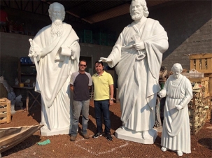 Chegaram nesta quarta-feira a Campo Mourão as imagens de São Pedro e de São Paulo que serão instaladas em frente à Catedral São José. Olha aí o padre Adilson Naruishi ao lado delas, junto com o artista, de Marechal Cândido Rondon. A imagem menor é de São José, que irá compor o memorial do santo.