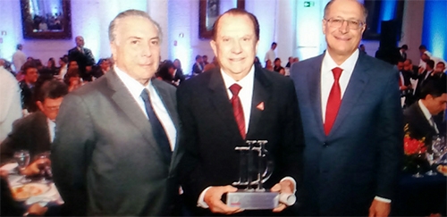 Olha aí o presidente da cooperativa, José Aroldo Gallassini, com o prêmio ao lado do vice-presidente Michel Temer, que está de presidente em exercício, e o governador de São Paulo, Geraldo Alckmin.