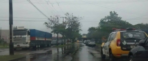 Na av. Goioerê, em Campo Mourão, viatura da Polícia Militar estacionada de um lado da via, carreta passando do outro.