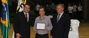Cinco placas foram entregues na cerimônia de reinauguração do ginásio Belin Carolo. Uma foi para a família Carolo, que doou o terreno para a obra. Outra para o prefeito da época, Renato Fernandes Silva. Também ganharam placas o professor Vicente Piazza Filho, o então secretário de Esportes Alcir Schen (represnetado pela filha, a vereadora Elvira Schen) e o engenheiro da obra, Élio Rodrigues de Mattos (foto).