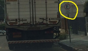 Na rua Santa Cruz, área central de Campo Mourão, caminhão estaciona em local em que placa alerta que é vaga para idosos cadastrados. O mesmo caminhão ficou com a dianteira sobre vagas para motos.