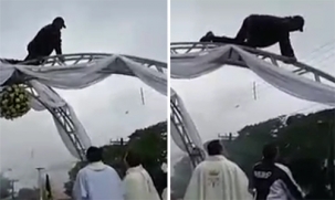 Olha só o flagra feito segunda-feira, no Santuário da Vila Urupês, bem na hora da consagração a Nossa Senhora Aparecida. A padre Carlos Cesar Cândido fazia a celebração ao ar livre quando um homem subiu pela estrutura metálica, passando sobre altar improvisado. Até o padre se assustou com a ação. Viu só, até o homem-aranha é devoto da santa...