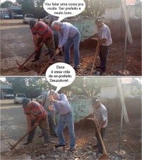 Olha só as fotos que o ex-prefeito Nelson Tureck postou no Facebook. É ele mesmo, dando uma mãozinha ao pessoal que trabalhava na demolição de uma velha calçada na rua Roberto Brzezinski. Ah, isso é moleza. Duro é ter que ficar se explicado pra Tribunal de Contas, Ministério Público, judiciário...