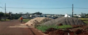 “Já não tem calçada feita, já tem mato no local e ainda por cima colocam mateiral de construção sobre todo o espaço onde deveria ser o passeio público. Foto do jardim Albuquerque”.