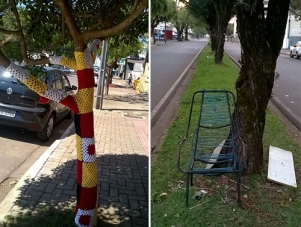 Lembra as árvores revestidas de crochê da rua Edmundo Mercer? A moda tá pegando e já tem árvore assim também na rua Francisco Albuquerque, em frente à Câmara.