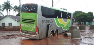 Um ônibus da Brasil Sul encalhou na manhã desta segunda-feira na rua Albino Casali, perto da rodoviária de Peabiru. O buracão estava ali por causa da construção de gelerias na via e não havia sinalização.