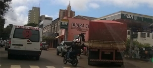 “Ao meio-dia desta quarta-feira, carreta passa pela av. Irmãos Pereira, no centro de Campo Mourão. Aparentemente ao perceber que estava na área central, parou no posto de combustíveis”.