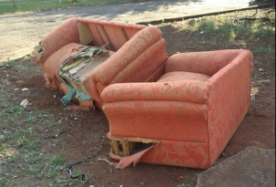 “Sofá velho jogado na Perimetral Tancredo Neves, esquina com a rua Hilda Menin”.