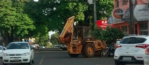 “Quando a gente acha que já viu de tudo, olha só o que aparece no estacionamento diagonal em Campo Mourão. Um trator com retroescavadeira estacionou nesta terça-feira pela manhã na rua São José, na área central da cidade. O trator ficou na vaga e a pá no meio da pista”.