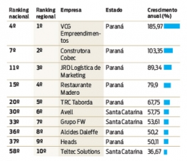 Uma empresa de Campo Mourão apareceu na lista das pequenas e médias que mais cresceram no Brasil entre 2012 e 2014. Com crescimento anual de 50,2%, a Pro Solus do Brasil (Alcides Daleffe é sócio-proprietário), do ramo de máquinas e equipamentos, ficou em 36º lugar no País e em 6º no Paraná. Em toda a região sul, ficou em oitavo. A 10ª edição da lista das PMEs que mais cresceram no Brasil foi feita pela Deloitte e teve resultado publicado neste fim de semana no jornal Gazeta do Povo. Ah, tá pensando o quê!...