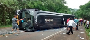Um ônibus do Expresso Nordeste tombou neste sábado à tarde na BR-487, próximo ao trevo de acesso ao Termas de Jurema, em Iretama. Cerca de 30 pessoas ficaram feridas e foram levadas para Campo Mourão. O ônibus estava fretado e segui para uma inauguração da Arcam, em Candói, na região de Guarapuava.
