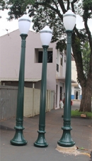 O que é isso: três postes republicanos na calçada?! Calma, que tem explicação. Foi para a revendedora de Maringá e o fabricante de Paranavaí mostrarem as diferenças dos postes de Campo Mourão com os de Cianorte, que custaram mais baratos.