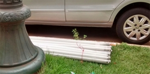 “Quase 20 lâmpadas jogada no canteiro central na av. Irmãos Pereira, em frente ao banco Itaú, no cento de Campo Mourão”.