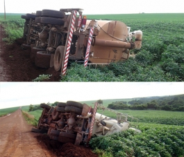Parece jogo dos sete erros, mas não é. Dois caminhões tombaram na mesma estrada rural, entre Mamborê e a comunidade rural do Guarani. O primeiro virou no sábado e o segundo nesta terça-feira. Foram três dias e 800 metros de diferença. Portanto, parece o mesmo acidente, mas não é. Tá igual Denorex, que parede remédio, mas não é...