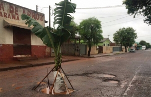 Por causa dos buracos, moradores protestam e Rua das Palmeiras (Nelson Bittencourt Prado), no Lar Paraná, vira “rua das bananeiras”.