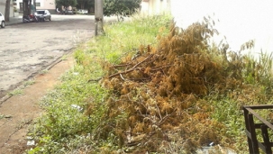 “Calçada na rua Santos Dumont, esquina com av. Jorge Walter dominada por lixo e mato. Uma vergonha”.