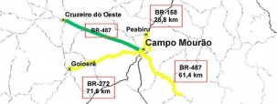 São elas a BR-158 (C. Mourão-Peabiru), a BR-487 (C. Mourão-Iretama) e a BR-272 (C. Mourão-Goioorê).
