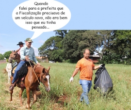 O clic é do fim de semana, quando aconteceu mutirão de limpeza contra o mosquito transmissor da dengue. A Associação de Cavaleiros e Amazonas de Campo Mourão participou. E olha só quem faz parte dela e também apareceu a cavalo: o secretário de Fiscalização, Edoel Rocha. Olha aí, não precisa mais nem precisa mais carro para a secretária. E esse aí é flex: aceita alfafa e capim...