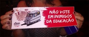 Grito de guerra de professores em protesto em frente ao Espaço Allure, durante evento da Comcam em que o governador Beto Richa seria homenageado; nesta quinta-feira à noite. Richa, que não tinha confirmado presença, também não enviou representante e o troféu "Coração do Paraná" dele não foi entregue.