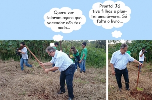 Para marcar o Dia da Água (22 de março), a Emater lançou um programa que visa a recuperação de 300 minas em Campo Mourão. A faculdade Integrado e o Colégio Agrícola são parceiros. O vereador Edson Battilani participou do lançamento e também teve que plantar a sua árvore. Pegou na enxada e tudo.