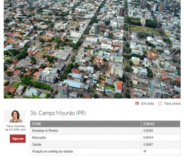 O site da revista Exame – www.exame.com – apresentou as 50 cidades mais desenvolvildas do Brasil. O texto de Talita Abrantes foi feito com base no ranking da Firjan, que a gente já divulgou por aqui. Campo Mourão aparece na 36ª posição. Extrema/MG é a líder. No Paraná, Campo Mourão é a quarta, atrás de Maringá (22ª), Apucarana (24ª) e Cianorte (35ª). Portanto, se tá ruim pra nós, imagine para as outras 5.500 cidades brasileiras...