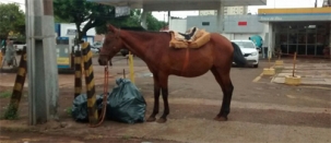Cena desta segunda-feira em Campo Mourão. Cavalo é visto “estacionado” sobre a calçada, na rua Santa Catarina, esquina com a av. Capitão Índio Bandeira”.