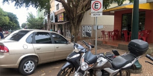 Na rua Brasil, quase em frente à prefeitura, a placa fala que o local é exclusivo para motos, mas tem carro estacionado por ali.