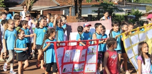 Acertou quem cravou a alternativa E. Alunos do 1º ao 5º ano da Escola Municipal Cidade Nova fizeram passeata nesta quarta-feira para chamar a atenção da população contra a proliferação do Aedes aegypti, o mosquito transmissor da dengue, zika vírus e chikungunya. O bairro está com alto índice de infestação do mosquito (5,26%). Portanto, a passeata é pelo impeachment do Aedes aegypti e conta o golpe de quem não cuida do seu quintal. Fora Aedes! Morador relaxado nunca mais!...