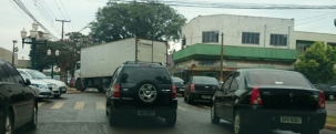 “Av. Irmãos Pereira, esquina com Santa Catarina. Caminhão transitando em horário impróprio para carga e descarga trava o transito de Campo Mourão”.