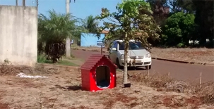 “Na av. Juscelino Kubitschek (Albuquerque) foi instalado uma casinha para cachorro se proteger do frio e chuva. Um excelente exemplo. A casinha está amarrada por corrente para ser evitado roubo”.