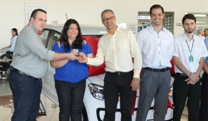 A Acicam entregou nesta quarta-feira o terceiro e último carro da promoção Compra Premiada. A professora Elisângela Barbato Gobbo recebeu o VW Up 0 km na Pirâmide Veículos. Foi um dos últimos atos de Newton Leal como presidente da Acicam, que elegeu novo presidente no mesmo dia. A Compra Premiada distribuiu R$ 133,3 mil em prêmios, incluindo três carros. Quem ganhou, ganhou, quem não ganhou que cruzes os dedos na próxima...