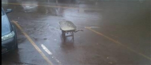 Em plena rua Brasil, na quadra da prefeitura, centro de Campo Mourão, carriola de construção civil usa vaga de estacionamento.
