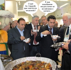 Olha aí mais uma foto do 10.o Festival de Turismo das Cataratas, em Foz do Iguaçu, onde foi servida uma degustaçãozinha do carneiro no buraco. O secretário de Estado Douglas Fabrício (Esporte e Turismo) e o presidente da comissão organizadora da 25.a Festa do Carneiro no Buraco, Nelson Casarolli, estiveram por lá. O prefeito de Foz, Reni Pereira, e o presidente da Fecomércio, Darci Piana, também estão na foto.