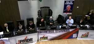 A prefeita Regina Dubay (PR) foi à reunião do PMDB e chegou a ser convidada para a mesa principal. Ela até foi, mas saiu e acompanhou o início do evento em meio ao público. Pouco depois se retirou.