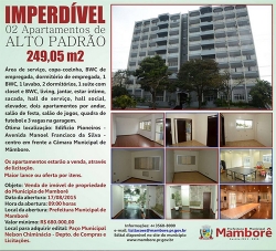 A prefeitura de Mamborê postou anúncio nas redes sociais para vender dos dois apartamentos que possui no edifício Pioneiros. O leilão será no próximo dia 17 (9h), com lance mínimo de R$ 680 mil pelos dois. “Imperdível, dois apartamentos de alto padrão”, diz a propaganda. Os imóveis são da prefeitura há cerca de 30 anos e serviram de residência para juízes e promotores. Dou-lhe uma, dou-lhe duas...