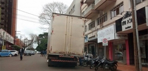 “Caminhão-baú para em fila dupla para fazer descarga na rua Harrison José Borges, no centro de Campo Mourão. A foto é da tarde desta quarta-feira”.