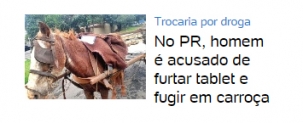 A história do homem que roubou um tablet e fugiu de carroça em Campo Mourão acabou sendo destaque nesta quinta-feira na página inicial do UOL, o maior portal do País. O tablet, que seria trocado por droga, foi recuperado e o ladrão foi preso. Mas a foto que correu o mundo é só do cavalo...